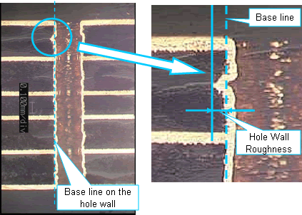 内壁粗糙度相对于玻璃胶布切割方向要大45度。(90°切割时为小) 孔壁粗糙度是将切片研磨至孔的正中央位置进行测量。研磨所至位置不同的话孔壁粗糙度也会发生变化,请务必注意。