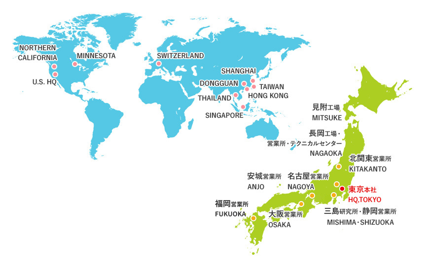 情報化社会の発展に伴い、市場は世界規模で拡大しています。 ユニオンツールでは、そうした流れに対応する体制づくりにいち早く着手。 1981年、カリフォルニア州に現地法人U.S. UNION TOOL, INC.(旧メガツール社)を設立したのを皮切りに、海外に生産・ 販売拠点を設置。