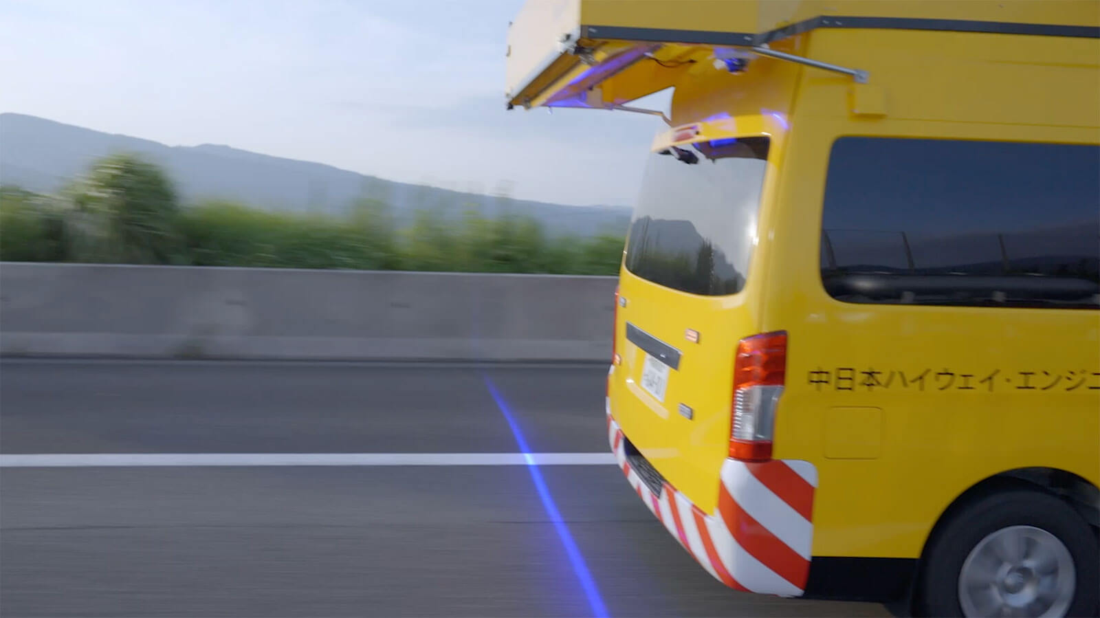 Equipped with a stereo camera capable of taking 3D images and illuminating the road surface with blue LED lights to take images, enabling measurement day and night.