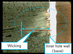 A cross section of the processed holes is made and where high levels of wicking appear a