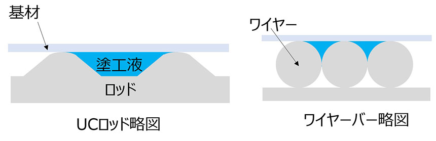 ワイヤーを使用していないことからワイヤレスバーとも呼ばれており、従来のワイヤーバーにはない特長を持っています。ワイヤーバーはワイヤーの太さを変更することで塗布量を変更していますが、UCロッドは溝形状を変更することでご希望の塗布量が得られます。この溝は自社製の高精度転造ダイスと長年培われた転造技術によって、ロッドへ均一に加工されます。