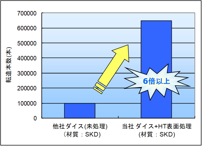HT表面処理を施すことにより、工具表面硬度を大幅に高め、従来の転造ダイスと比べ工具寿命を改善する事が可能です。母材はSKHより安価なSKDを用いることで、価格を抑えることが可能です。従来と同等なコストで長寿命を得ることができます。(SKHへの処理も可能です)