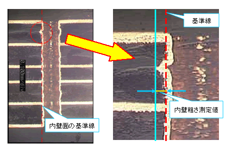 内壁粗さはガラスクロスに対しカット方向45°で大きくなります。(90°カットでは小) 加工穴中央の削り量の内壁粗さを測定します。削り量が異なると内壁粗さも変化しますので注意が必要です。