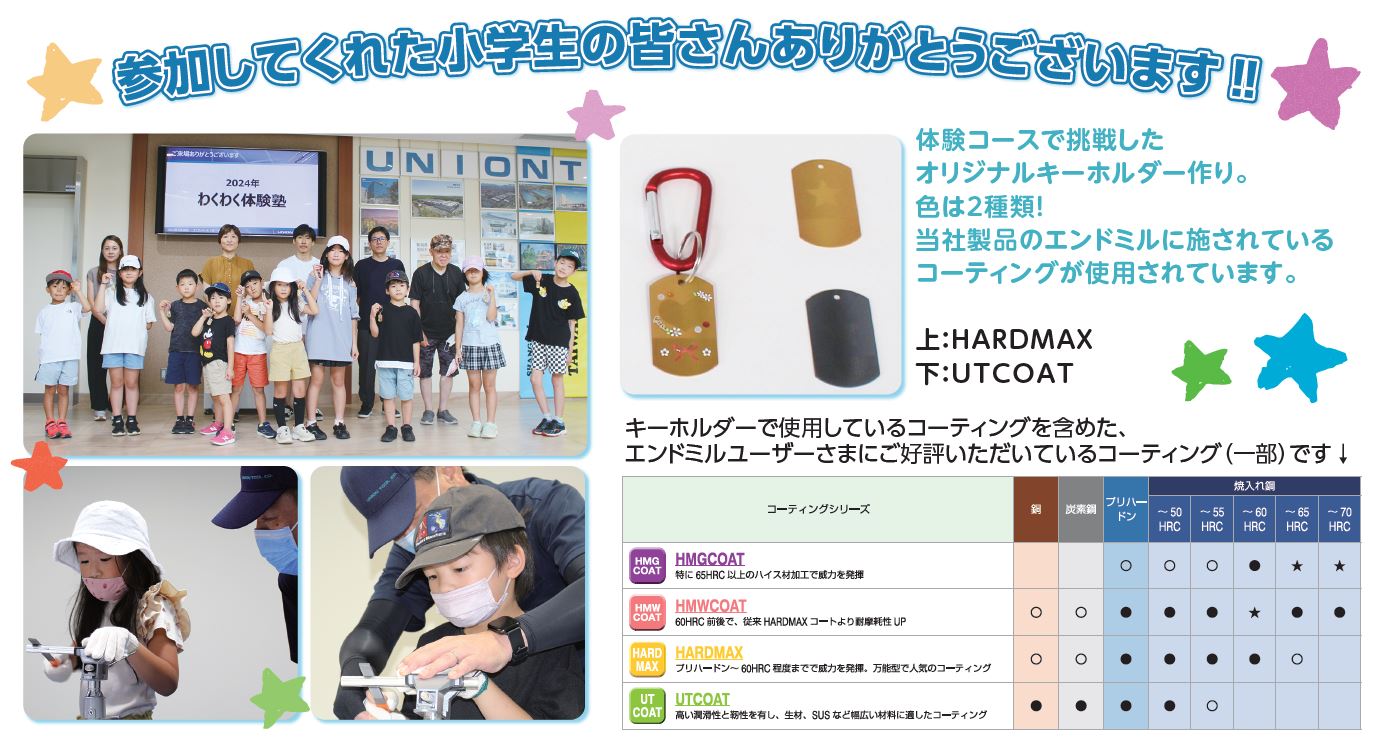 髪の毛に穴を明けられるドリルの説明を聞いた時や、コーティングすると表面が硬くなることを体験した子供たちの素直に驚く反応がとても新鮮です。「わくわく体験塾」にきた子供たちが将来ユニオンツールで働く仲間になってくれると嬉しいな、と思いながら、もっと楽しい「わくわく体験塾」にしていきたいと思います。