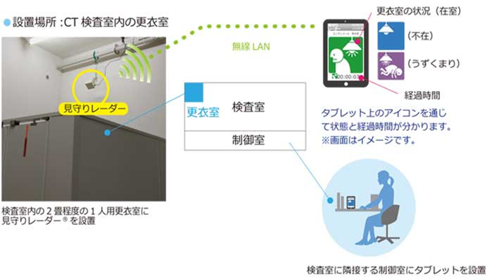 本製品の開発には埼玉医科大学病院様にご協力いただき、検査室内の更衣室見守りに活用されています。